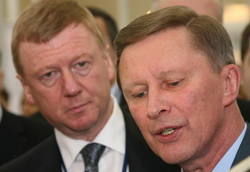 Генеральный директор ГК РОСНАНОТЕХ Анатолий Чубайс демонстрирует продукцию ЗАО "ТРЕКПОР ТЕХНОЛОДЖИ" первому вицепремьеру Правительства РФ Сергею Иванову